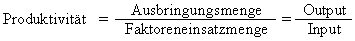 Produktivität ist das Verhältnis von Output zu Input. Die Produktivität ist ein mengenmäßiger Maßstab, der eine technische Wirtschaftlichkeit ausdrückt. Zu messen ist die Produktivität durch Bezugnahme des Ertrages bzw. der Leistung auf eine Einsatzeinheit oder durch das Verhältnis von Produktionswert zum Kapitaleinsatz oder zum Arbeitseinsatz.