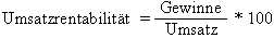 Diese Kennzahl zeigt, wie viel Prozent der Umsatzerlöse dem Unternehmen als Gewinn für Investitionszwecke und Gewinnausschüttung zugeflossen sind. Die Umsatzrentabilität ist aufschlussreich, wenn man Unternehmen, die auf ähnlichen Geschäftfeldern operieren, miteinan-der vergleichen will.